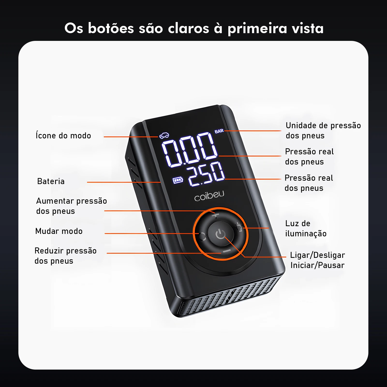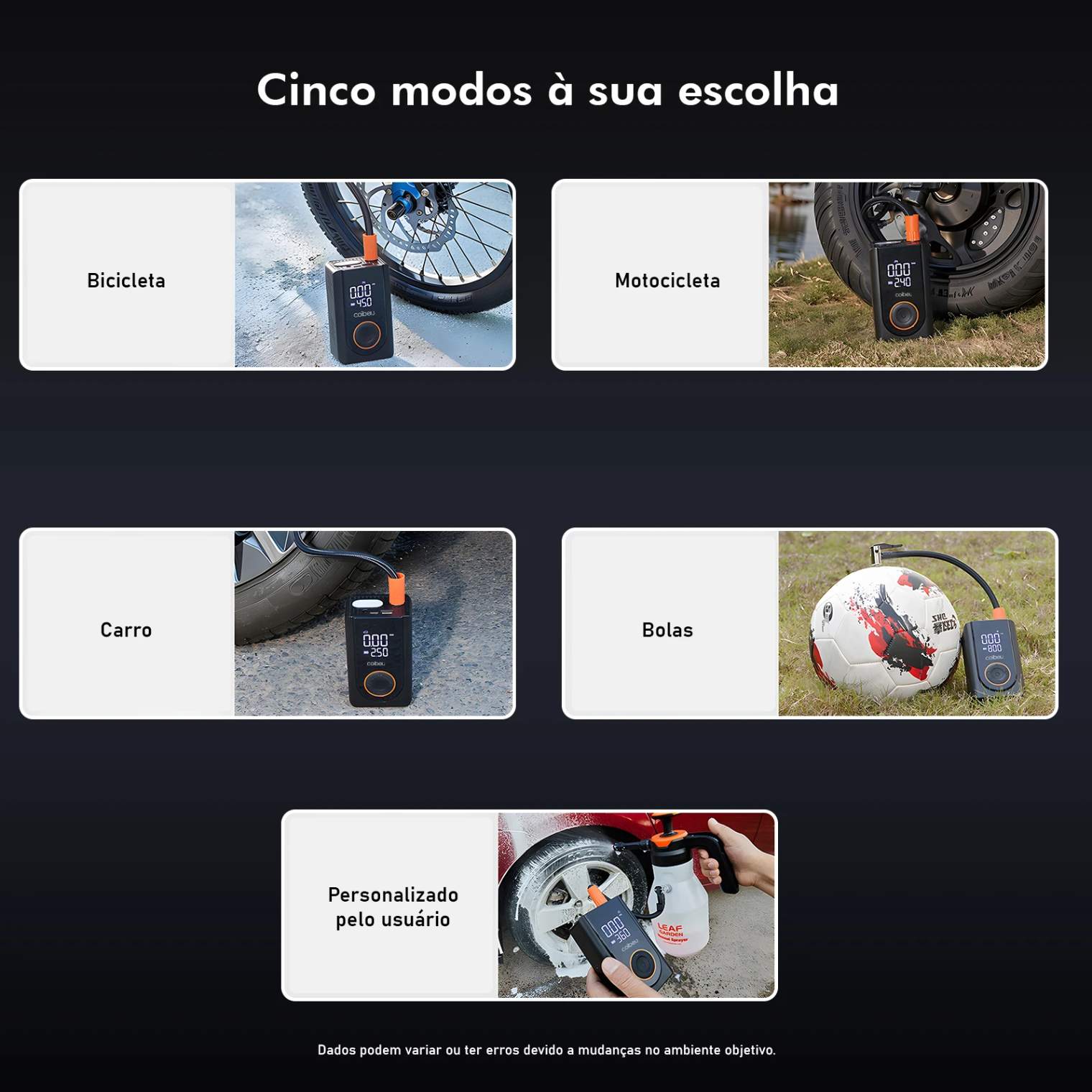 A bomba de inflação portátil é projetada para facilitar o uso, mesmo para iniciantes. Com 5 modos de inflação predefinidos, incluindo os específicos para Carro e Bicicleta, basta selecionar o modo desejado e pressionar um botão para iniciar o processo de inflação. Simples, rápido e eficaz!